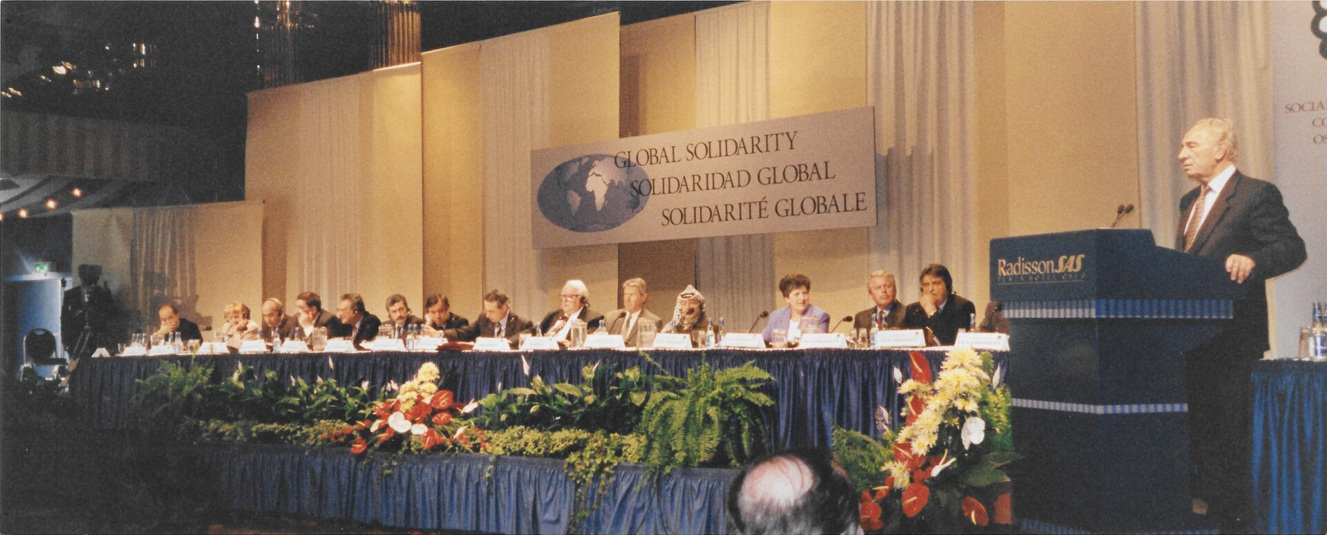 Introductory speakers focusing on the Middle East, Northern Ireland, and Bosnia and Herzegovina addressed the first of three aspects of the main theme - 'furthering humanitarian action and promoting initiatives for peace' - and gave firsthand accounts of their different experiences. Yasser Arafat, President of the Palestinian Authority, spoke of the constructive efforts by the International in support of a just, permanent and comprehensive peace in the Middle East and of his concerns for the future: `The alternative pending in front of us if the peace process in the region fails, is total chaos. And it will be very difficult to predict the extent and dimensions of such chaos'. Sharing Arafat's concerns, Shimon Peres, former leader of the Israel Labour Party, declared: `I do not believe that we can reach 100 per cent peace without providing the Palestinians with 100 per cent freedom, that we cannot have 100 per cent security without having 100 per cent peace'.